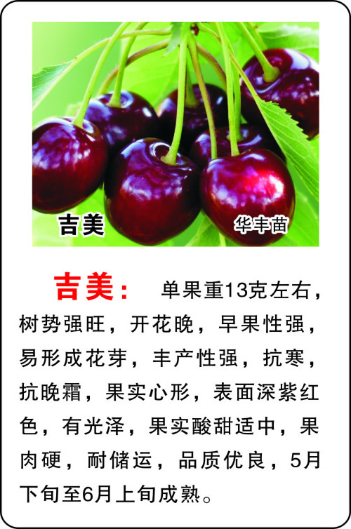 吉美櫻桃苗:單果重13克左右,樹勢強(qiáng)旺,開花晚,早果性強(qiáng),易形成花芽,豐產(chǎn)性強(qiáng),抗寒,抗晚霜,果實(shí)心形,表面深紫紅色,有光澤,果實(shí)酸甜適中,果肉硬,耐儲運(yùn),品質(zhì)優(yōu)良。5月下旬至6月上旬成熟。